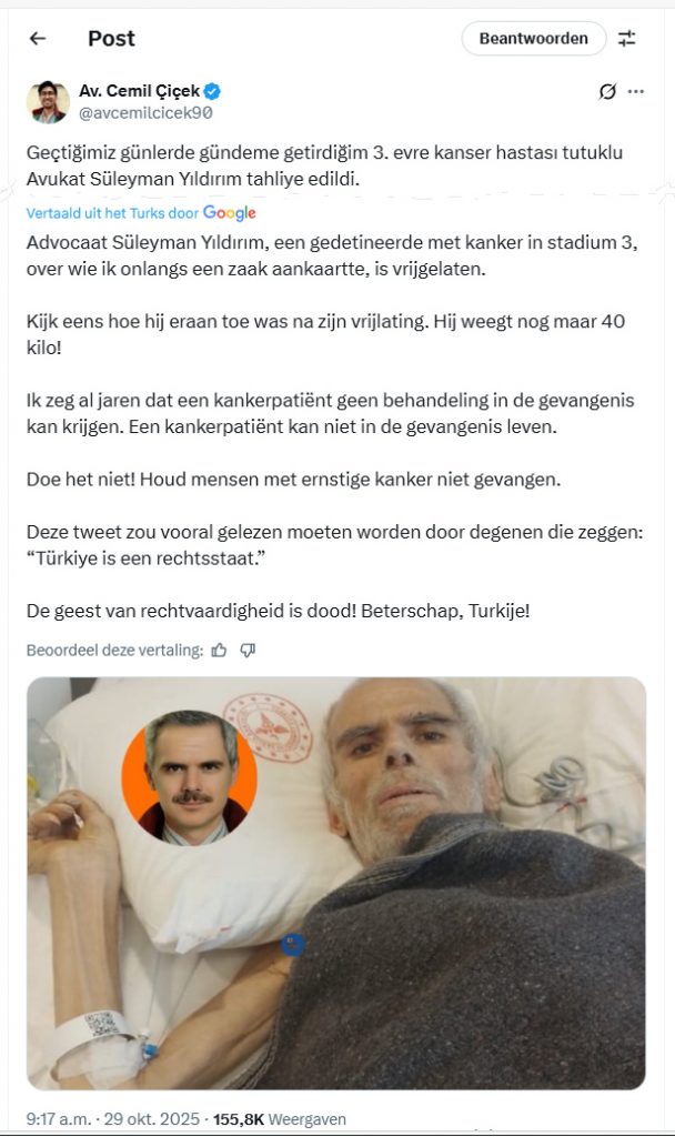 Mensenrechtenadvocaat Cemil Çiçek, die eerder zijn zorgen over de zaak had geuit, deelde na zijn vrijlating foto’s van Yıldırım op sociale media en schreef: “Kijk eens hoe hij eraan toe was toen ze hem eindelijk lieten gaan, hij woog nog maar 40 kilo. Stop met het opsluiten van mensen met vergevorderde kanker.”