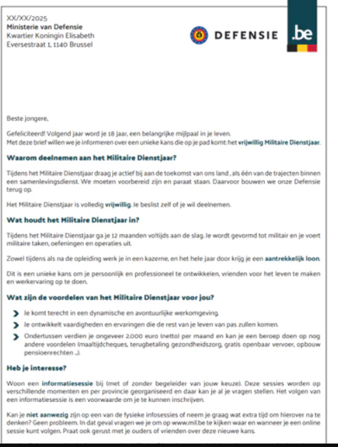 Tegen het einde van 2025 hebben alle 17-jarigen in België – circa 130.000 mensen – een informatiebrief ontvangen over deze nieuwe vrijwillige militaire dienst.